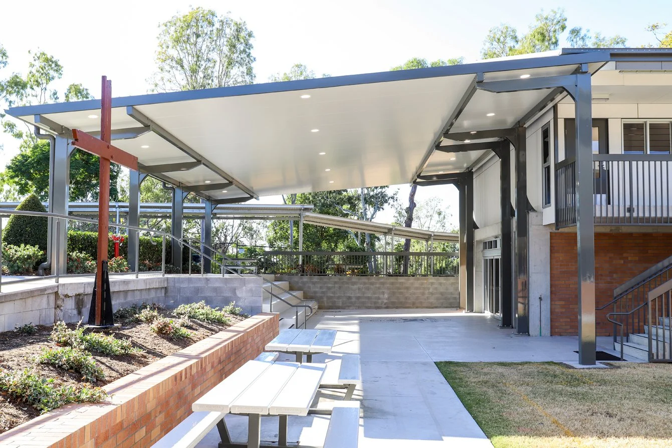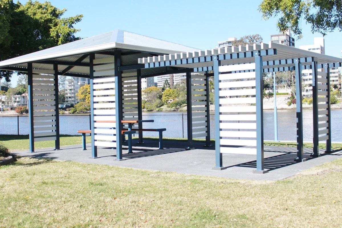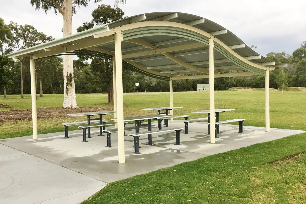 Our shade structures are manufactured using our proven heavy-duty hot dip galvanised steel column and beams structure and our unique Colorbond Locsteel roof battens.